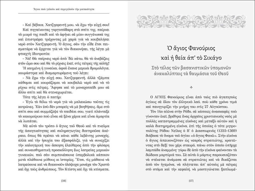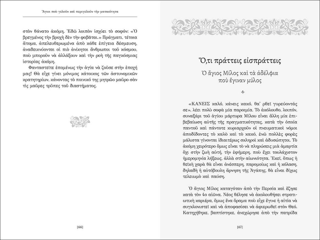 «Μόνον οἱ Ἅγιοι ὡς ξεσκλάβωτοι ἀπὸ τὰ “πρέπει” τοῦ κόσμου καὶ τοῦ “ἐγώ” τους δύνανται νὰ ξεσαμαρώνονται ἀπ’ τὰ σαμάρια καὶ τοὺς κανόνες τοῦ κόσμου. Ἔτσι λεύτεροι κι ἄφοβοι Χριστοαντάρτες, φυσικὰ καὶ ἀβίαστα διαλαλοῦν τὴν χαρά, τὸ χαμόγελο, καὶ περιγελοῦν κι ἐξαπατοῦν τὸν ἀπατεῶνα κόσμο. Ὅπως αὐτονόητο εἶναι ὁ ἥλιος νὰ ζεσταίνει, τὰ σύννεφα νὰ βρέχουν, τὸ νερὸ νὰ ξεδιψᾶ…