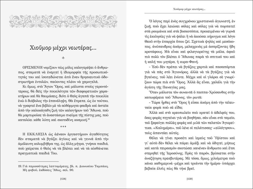 Κάθε νέο βιβλίο του πατρός Διονυσίου Ταμπάκη είναι και μία έκπληξη. Ο εφημέριος του ιστορικού ναού της Παναγίτσας του Ναυπλίου γράφει έχοντας στο νου την πνευματική ωφέλεια των συγχρόνων αναγνωστών, χρησιμοποιώντας μια γλώσσα ζωντανή, απλή, ιλαρή, ευχάριστη, καθημερινή, χαρούμενη αλλά συνάμα πλούσια. Μια γλώσσα που έχει διαμορφωθεί από την κρητική και σμυρνέϊκη καταγωγή του, το μεγάλωμά του στην Παλαιά Κοκκινιά και προπάντων την αγάπη του για τον Άθωνα και την ορθόδοξη παράδοσή μας. Αν προσθέσουμε και μία ατμόσφαιρα σαλότητας που διέπει το βιβλίο και κρύβει πολύ βαθιές και σημαντικές αλήθειες, θα έχουμε μια πρώτη ιδέα για το νέο του βιβλίο που κυκλοφόρησε ανήμερα της εορτής του αγίου Διουνυσίου του νέου.