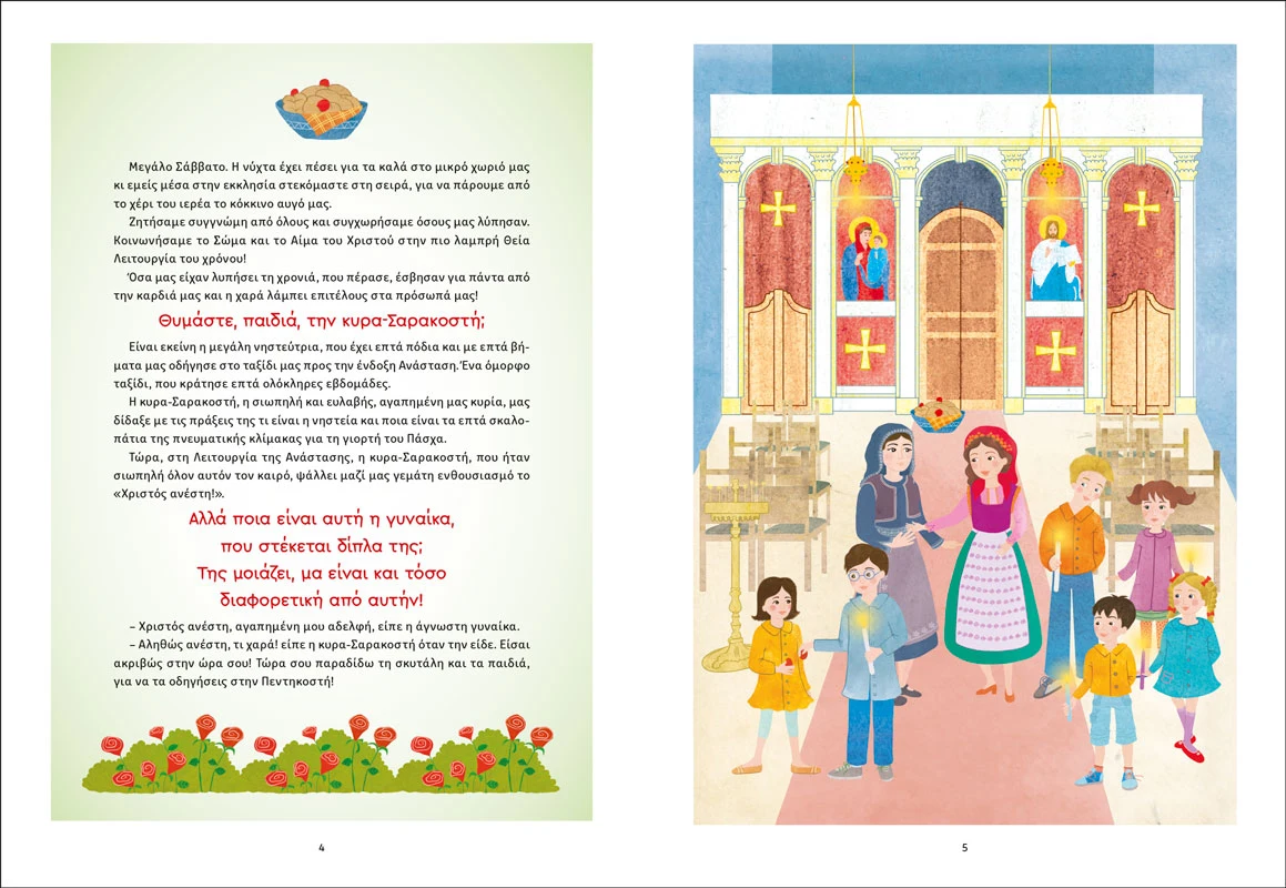 Η κυρα-Πεντηκοστή, αδελφή της γνωστής κυρά-Σαρακοστής, φτάνει το Πάσχα φορτωμένη αναστάσιμες ευχές και πασχαλινά καλούδια. Μαζί με μια χαρούμενη παρέα παιδιών ξεκινά ένα όμορφο ταξίδι μέσα στις εβδομάδες του Πεντηκοσταρίου, ανεβαίνοντας συμβολικά επτά «σκαλοπάτια» που οδηγούν στη μεγάλη δωρεά του Αγίου Πνεύματος.