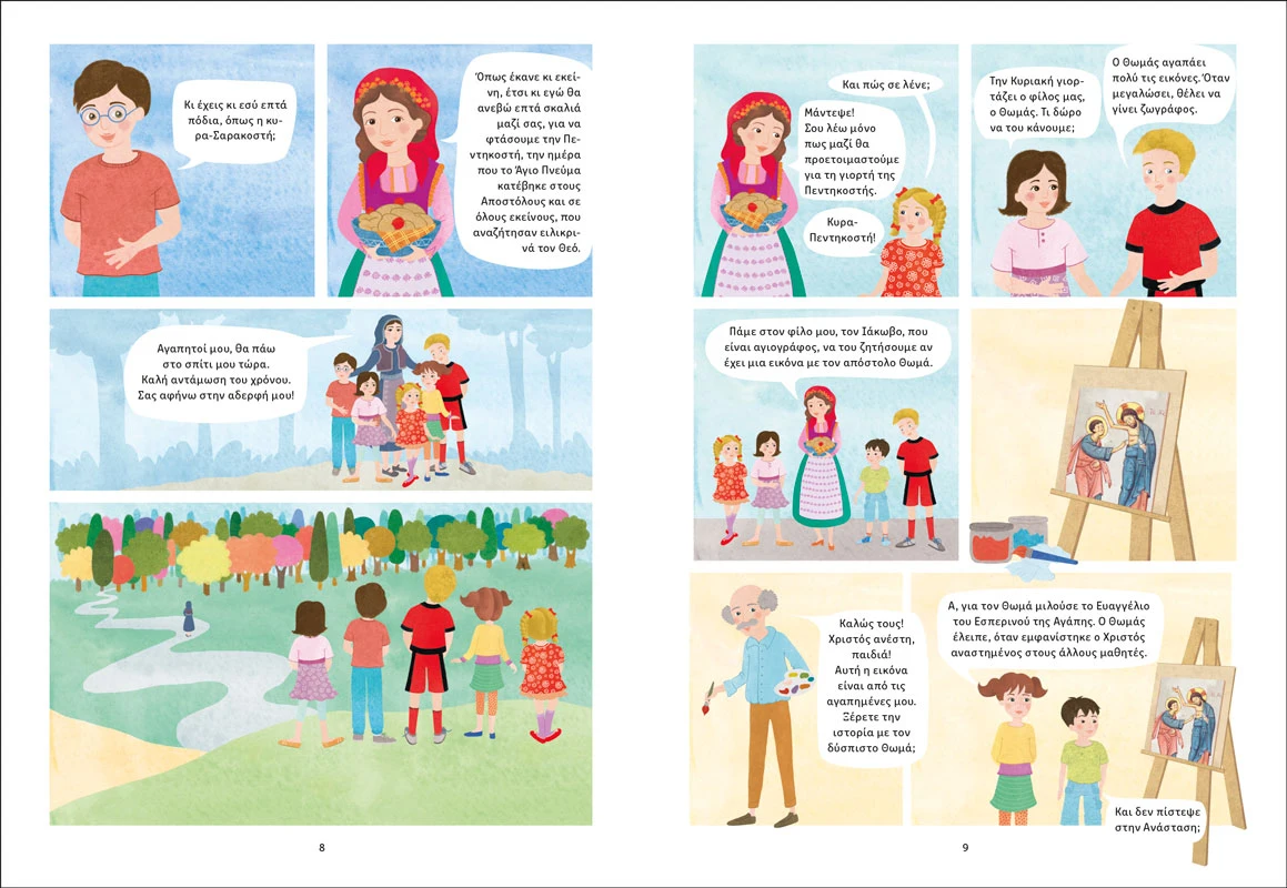 Οι Εκδόσεις Άθως παρουσιάζουν το νέο πρωτότυπο παιδικό βιβλίο Η κυρα-Πεντηκοστή και τα 7 σκαλοπάτια, ένα ευρηματικό κόμικ που οδηγεί τα παιδιά από τη χαρά της Ανάστασης μέχρι τη μεγάλη γιορτή της Πεντηκοστής.