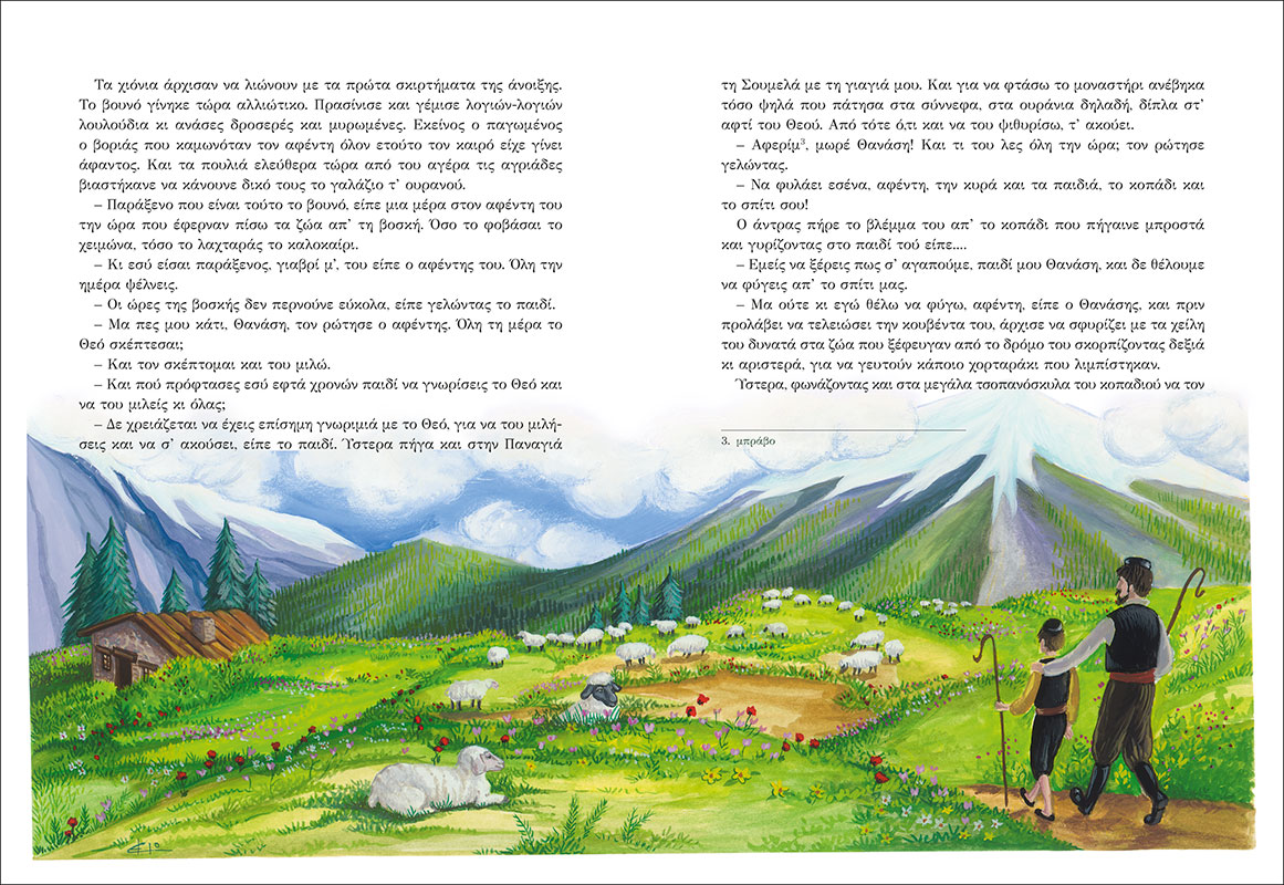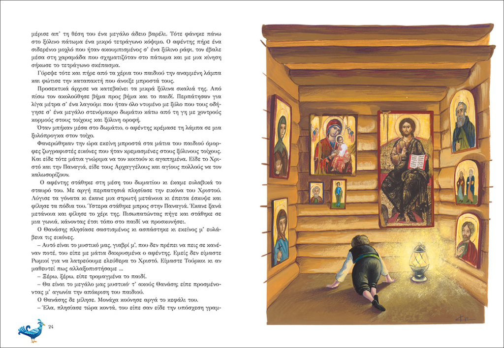 Σ’ εκείνα τα ευλογημένα χώματα αντάμωσε το παιδί μια μέρα τον Άγιο. Κι απ’ τη στιγμή που ο Αϊ-Γιώργης τον ανέβασε στη σέλα του αλόγου του, έγινε προστάτης και οδηγός του.