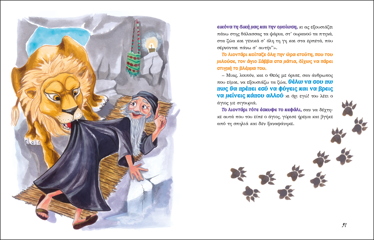 Μέσα από μικρές και ξεχωριστές ιστορίες, τα παιδιά γνωρίζουν «τρομερά» θηρία και ατρόμητους θηριοδαμαστές από τις ζωές αγίων και ασκητών, που έζησαν σε αρμονία με τη δημιουργία.