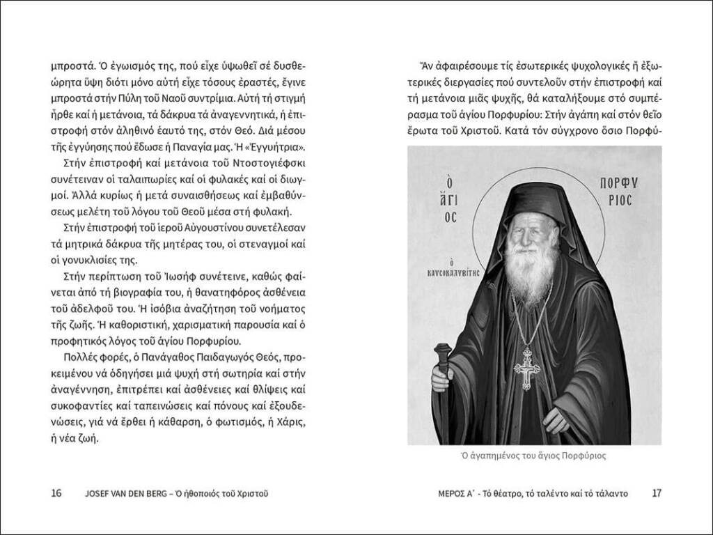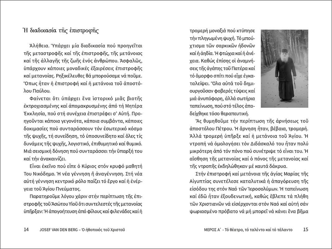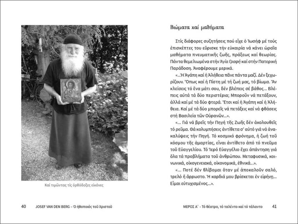 Ένα σπάνιο βιβλίο – ντοκουμέντο: η πορεία ζωής του επιτυχημένου Ολλανδού ηθοποιού Γιόζεφ βαν ντεν Μπεργκ, που έζησε τη συγκλονιστική μεταστροφή του στην Ορθοδοξία και εκοιμήθη στο μοναστήρι της Μεταμορφώσεως Σοχού Χαλκιδικής ως ασκητής. Στο βιβλίο παρακολουθούμε στο πρώτο κεφάλαιο τα διάφορα στάδια της ζωής του, στο δεύτερο κεφάλαιο θα διαβάσουμε συγκλονιστικά, πνευματοφόρα αποσπάσματα του προσωπικού του ημερολογίου και στο τρίτο κεφάλαιο θα βρούμε δημοσιεύματα σχετικά με αυτόν και συνεντεύξεις. Το βιβλίο κλείνει με ένα εξαιρετικό ένθετο έγχρωμων φωτογραφιών του ασκητή Γιόζεφ βαν ντεν Μπεργκ.